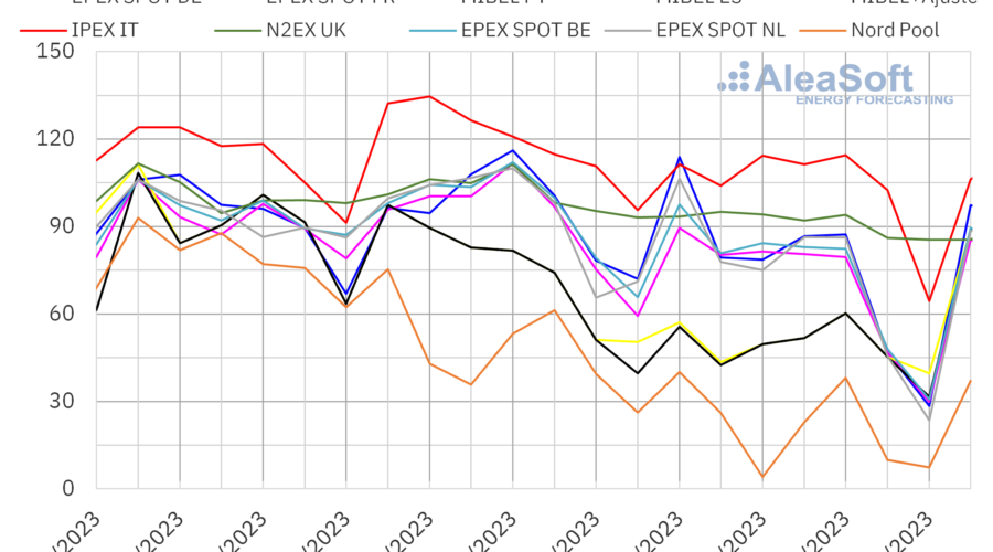 En la tercera semana de mayo, el precio promedio más elevado, de 103,21 €/MWh, fue el del mercado italiano, seguido por el promedio del mercado británico, de 91,46 €/MWh. Por otra parte, el menor promedio semanal fue el del mercado nórdico, de 21,23 €/MWh. En el resto de los mercados analizados, los precios se situaron entre los 48,07 €/MWh del mercado español y los 74,43 €/MWh del mercado EPEX SPOT de Alemania.