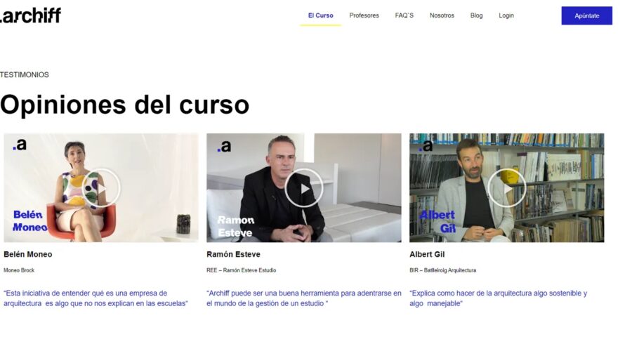 El sistema de Archiff, primer programa formativo online de la plataforma homónima, ha sido desarrollado pensando en la realidad laboral de un perfil profesional. De este modo, una vez adquirido el curso, este puede ser realizado siguiendo el orden de las unidades, que además de las lecciones, incluyen diferentes contenidos adicionales como vídeos o descargables, o bien directamente trabajando los temas que más se necesite reforzar.
