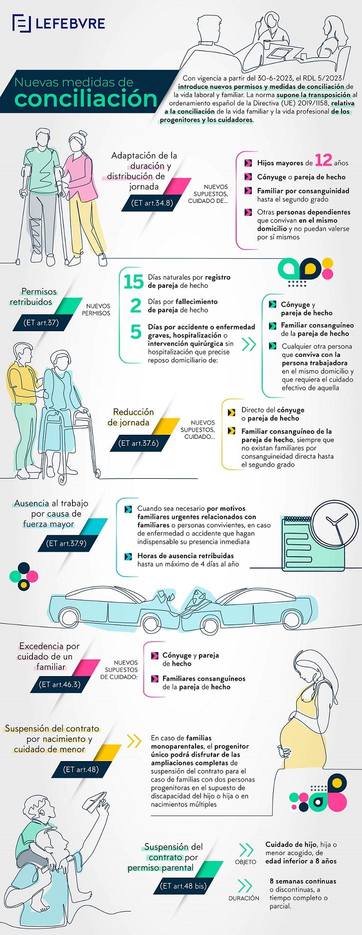 El pasado 29 de junio se publicaron en el BOE las modificaciones sobre las medidas de conciliación. El RDL 5/2023 introdujo nuevos permisos y medidas de conciliación de la vida laboral y familiar. La norma supone la transposición al ordenamiento español de la Directiva (UE) 2019/1158, relativa la conciliación de la vida familiar y la vida profesional de los progenitores y los cuidadores, siendo unas medidas de gran interés. Por ello, los expertos de Lefebvre, compañía de software y contenido jurídico líder en España, analizan las principales novedades relativas a la nueva ley: